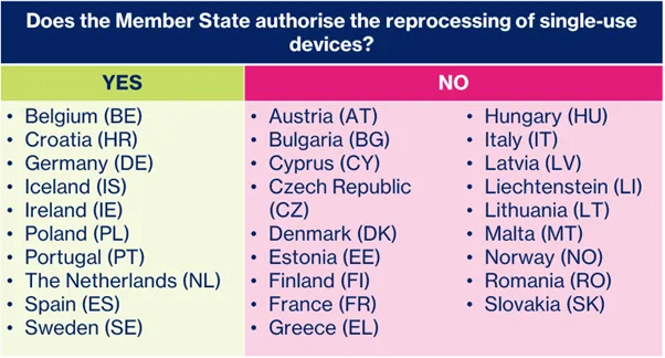 That’s nice and clear. The reprocessing of single-use devices needs to be permitted by national law in a specific Member State before any of the subsequent MDR requirements in Article 17 are considered. For those organisations involved with reprocessing single-use devices (and those manufacturers with single-use devices who know or suspect that their devices are being reprocessed), this could be a complicated situation to keep track of. It is, but the Commission do make it slightly easier by providing a whole section of their website devoted to reprocessing of single-use devices 13. Member States are obliged to inform the Commission of their national provisions on this subject, and the Commission then share that information. Thus, we know that the many Member States do not authorise reprocessing of single-use devices on their territory (See Figure 2). For those Member States that do authorise reprocessing of single-use devices, we are provided with a summary of which parts of Article 17 are permitted, not permitted and restricted; plus links to the national legislation also.